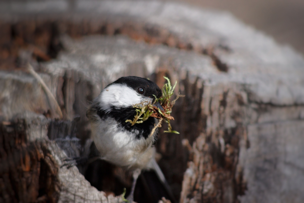 À l’intérieur d’une petite cavité, un nid de mésange à tête noire reste en grande partie caché à la vue. Les oiseaux utilisent des trous d’arbres ou des ouvertures similaires et tapissent le nid de mousse, de fourrure et d’autres matériaux mous. De l’extérieur, vous ne verrez peut-être qu’une petite ouverture sombre dans l’écorce. Les parents qui font des allers-retours le donnent souvent.