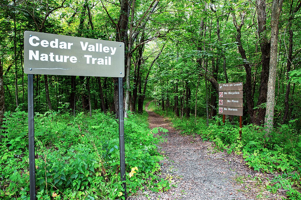 S’étendant sur 50 miles, le Cedar Valley Nature Trail relie plusieurs communautés de l’est de l’Iowa. Le sentier propose de nombreux courts segments qui traversent des paysages ruraux paisibles et des parcs urbains. Avec sa surface lisse et pavée, le sentier est parfait pour les marcheurs, les coureurs et les cyclistes de tous niveaux. Les boucles du parc près de Cedar Falls et de Waterloo offrent des endroits pratiques pour profiter d’un bref repos tout en s’imprégnant de la beauté de la région.