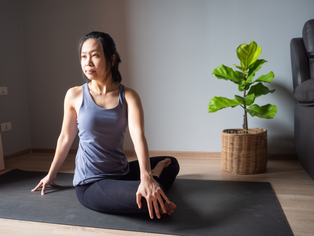 Asseyez-vous bien sur une chaise, les pieds à plat sur le sol et le dos droit. Tournez doucement votre torse vers la droite, en plaçant votre main gauche à l’extérieur de votre cuisse droite pour vous soutenir. Pendant que vous vous tournez, essayez de garder vos hanches tournées vers l’avant et votre colonne vertébrale longue. Maintenez la torsion pendant 20 à 30 secondes, puis revenez lentement à la position de départ et répétez de l’autre côté. Cet étirement contribue à améliorer la mobilité et la flexibilité de la colonne vertébrale.