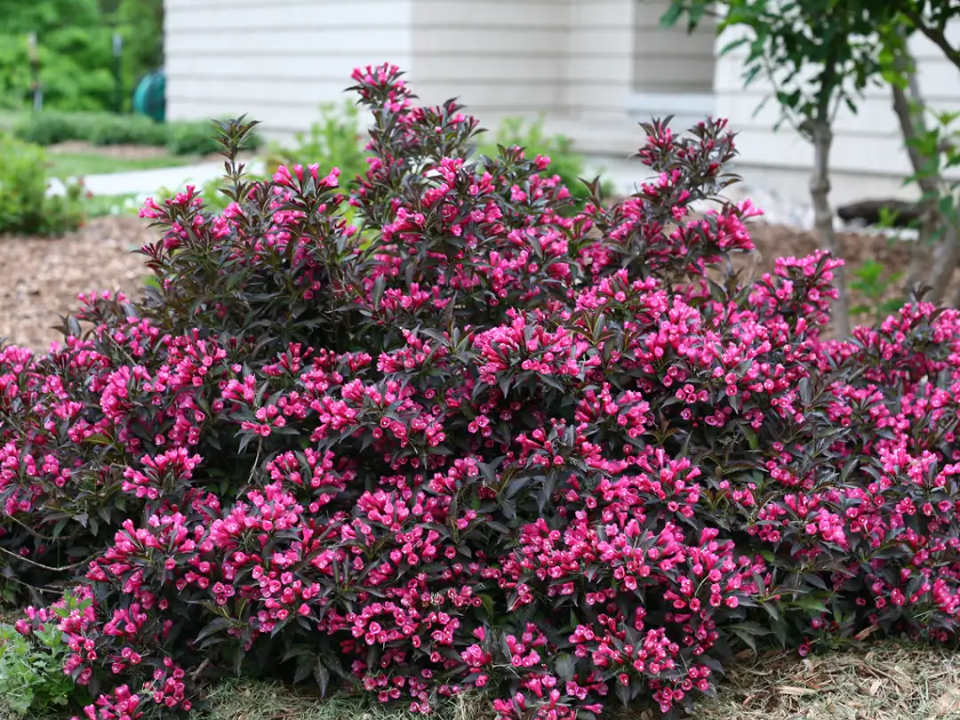 Weigela Sppilled Wine a une forme arrondie et des feuilles riches et sombres qui donnent aux petits jardins beaucoup de personnalité. Il pousse généralement autour de 2 à 3 pieds de haut et s’étend un peu plus large, ce qui l’aide à remplir un espace sans prendre le dessus. Au printemps, des fleurs roses en forme de trompette recouvrent les branches et attirent les colibris.