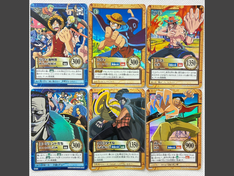 Les ensembles de Carddass One Piece ont fait leurs débuts en 2001 et sont rapidement devenus populaires au Japon. Les cartes ont illustré les aventures de Luffy et de son équipage, avec des scènes prises dans les arcs de Blue East et Alabasta. Ces ensembles ont servi de collection précoce avant l’introduction du récent jeu de cartes One Piece.