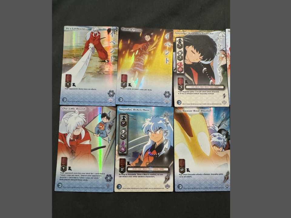 Score Entertainment a publié le jeu des cartes à échanger Inuyasha en 2004, apportant le monde fantastique féodal aux fans sous forme de cartes. Avec des personnages comme Inuyasha, Kagome, Sesshomaru et Naraku, les cartes ont mélangé l’art des personnages avec les mécanismes de gameplay. Alors que le jeu de cartes s’est finalement terminé, les sets sont devenus aimés pour leur nostalgie.