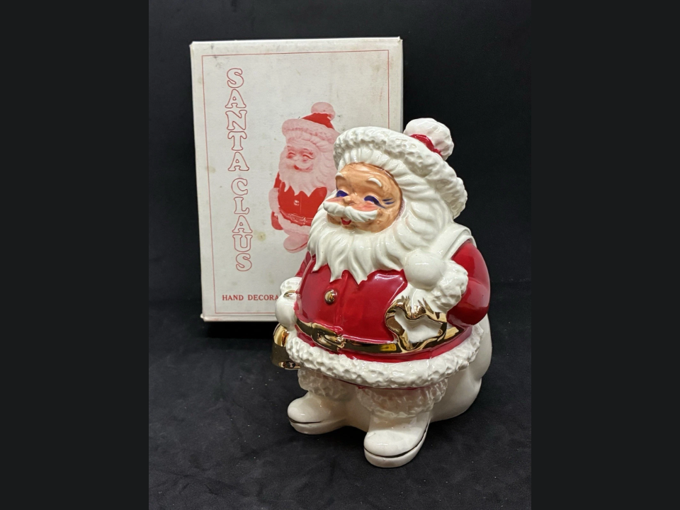 L’émail a tendance à vieillir avec le temps, donnant à chaque figurine une finition unique qui ajoute du charme. Un Père Noël en céramique bien conservé de cette décennie suscite généralement un grand intérêt parmi les collectionneurs de vacances. Certaines pièces sont accompagnées d’autocollants originaux provenant de petits studios de poterie, ce qui ajoute à leur histoire. Un exemple de haute qualité se vend souvent autour de 75 $.