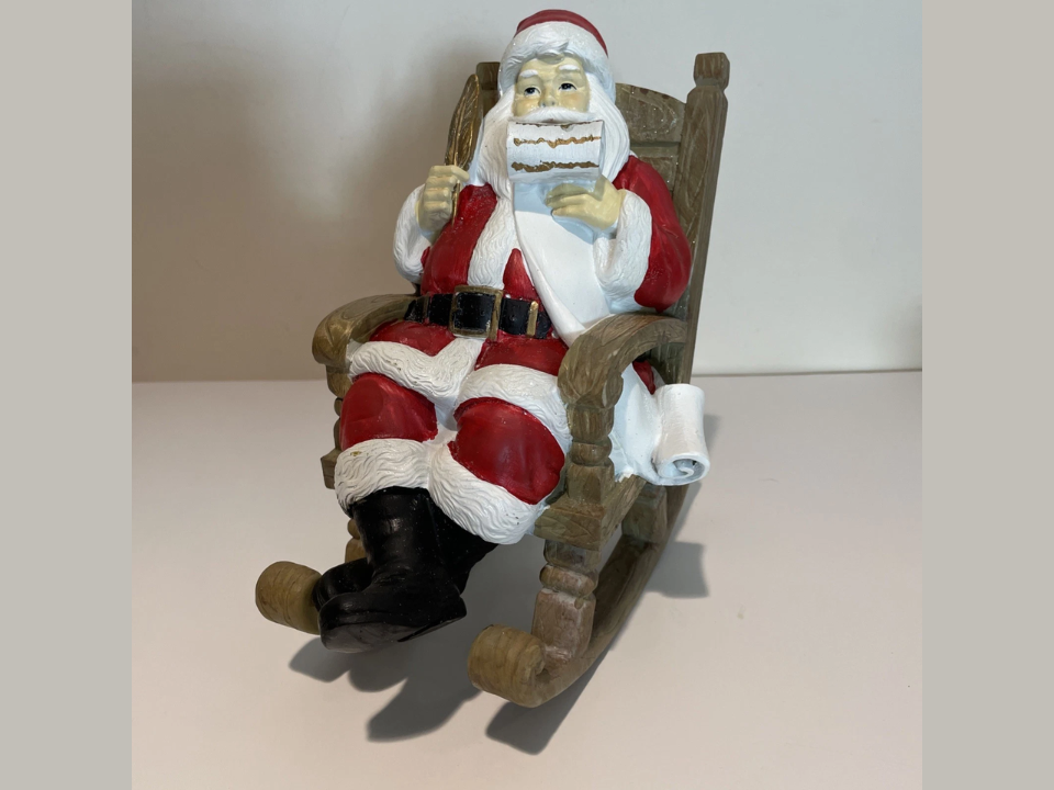 Une figure du Père Noël assis dans un fauteuil à bascule représente souvent un moment de calme avant ou après sa nuit de voyage bien remplie. Ces personnages montrent généralement le Père Noël lisant une liste, caressant un petit animal ou tenant une boisson chaude. De nombreuses familles ont placé ces figurines près des cheminées, ce qui a contribué à créer une ambiance chaleureuse pour les fêtes.