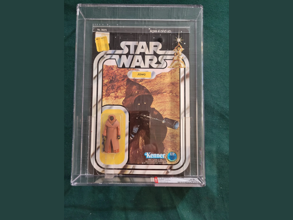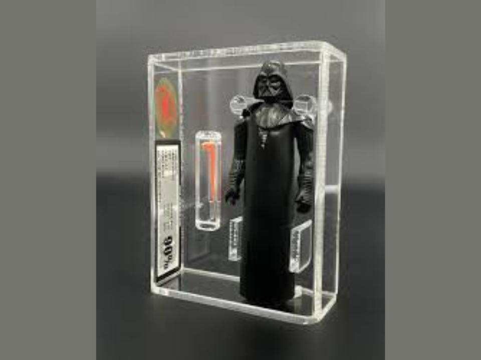 Des cartes de collection non perforées, avec des bords nets et sans étiquette de prix, et de nombreux exemples survivants montrent une forte usure des étagères parce que les enfants et les parents les ont manipulées dans les magasins. Lorsque les sociétés de notation évaluent ce chiffre, elles notent à la fois la carte et la bulle, et une petite fissure ou un jaunissement peut faire chuter la valeur de plusieurs dizaines de milliers de dollars. L’emballage d’origine préserve également l’alignement du sabre, du plateau et de la figurine intérieure, ce qui est important lorsque les acheteurs paient l’argent de la maison pour un jouet.