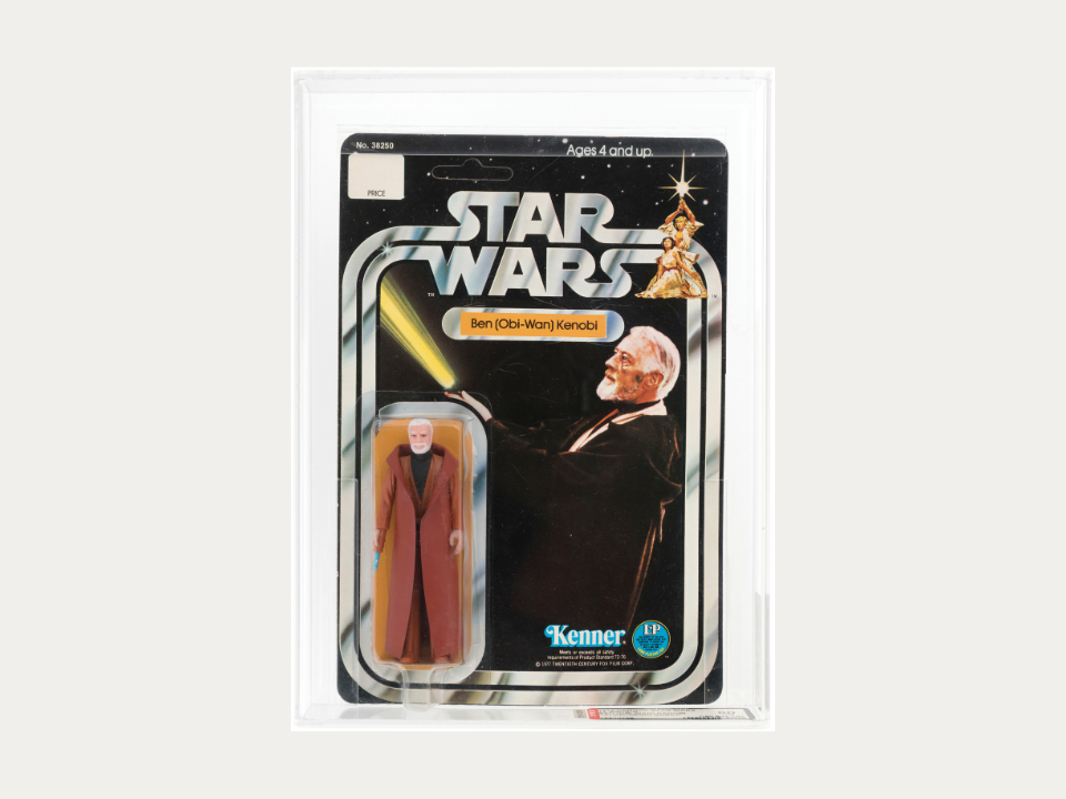 La carte originale à 12 dos avec l’art d’Obi Wan et le logo Star Wars est cruciale car elle confirme que le sabre et la figurine ont commencé leur vie ensemble. De nombreux exemples survivants souffrent de fissures de bulles ou de décoloration des cartes, car ils sont restés dans des fenêtres ou sur des crochets pendant des mois avant que quiconque ne se soucie de les sauvegarder. Les sociétés de notation attribuent des scores distincts à la carte, à la bulle et au chiffre, et les collectionneurs paieront une prime lorsque les trois nombres sont élevés.