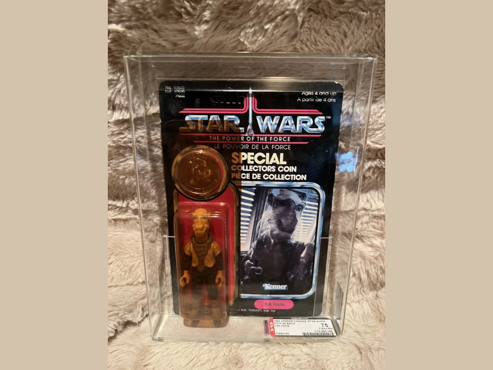 Yak Face est arrivé juste à la fin de la série originale de Kenner et n’a jamais été diffusé à grande échelle en Amérique du Nord, ce qui en fait déjà un chiffre difficile à trouver. La plupart des exemples de cartes proviennent de cartes récentes du Pouvoir de la Force d’Europe ou d’autres marchés internationaux, et ils incluent souvent la pièce de collection que les enfants ont autrefois négligée. Les guides de prix indiquent que les figurines Yak Face sur carte se vendent à environ 6 700 $ en bon état, tandis que les copies volantes ont tendance à atterrir autour d’un quart de ce montant.