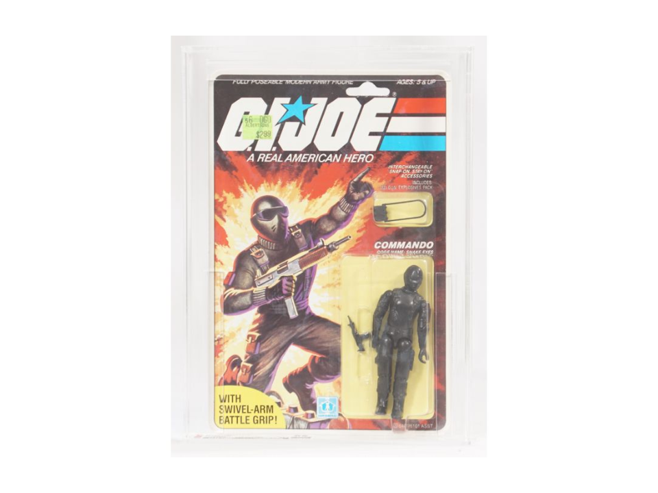 La première version de Snake Eyes de la ligne GI Joe de 1982 a un design noir simple et aucune peinture sur le visage, mais la figurine est devenue une pierre angulaire pour les collectionneurs de Joe vintage. Les premiers exemples sur carte avec la construction du bras droit ont toujours été difficiles à trouver, car les enfants jouaient dur avec ce personnage particulier. Les guides de prix répertorient les copies sur carte entre 900 $ et 1 200 $, tandis que les exemples individuels changent souvent de mains pour environ 90 $ à 140 $ selon les accessoires et l’état.