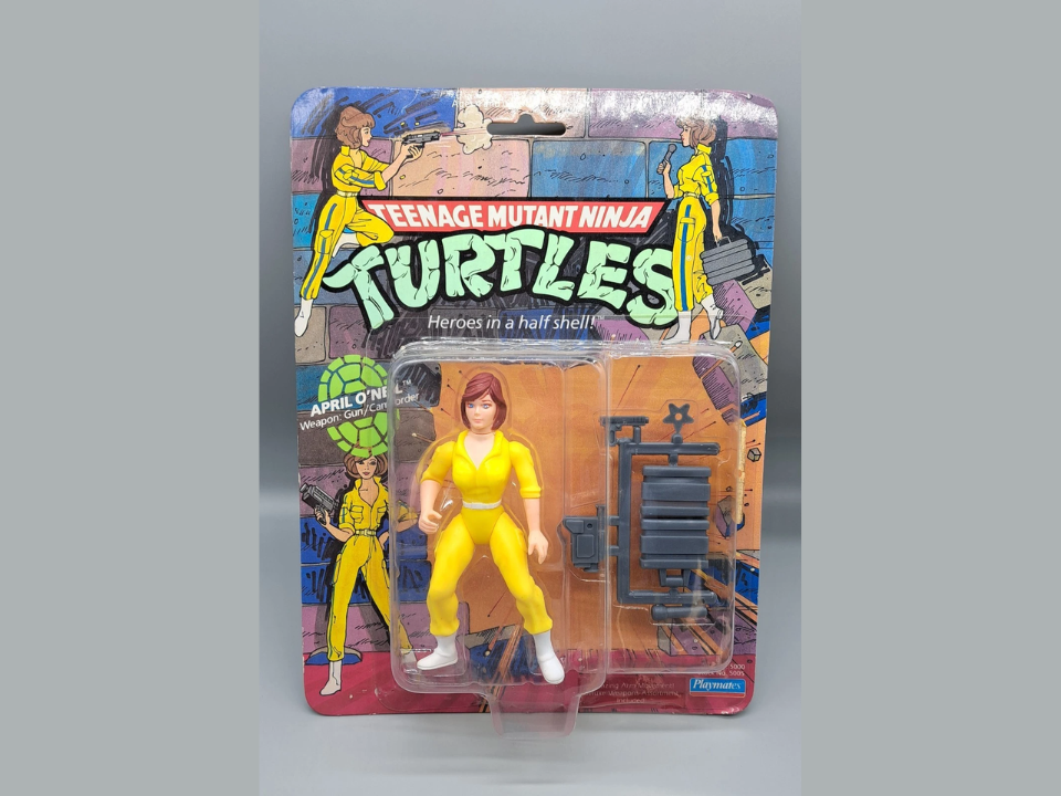 La figurine originale d’April O Neil de Tortues Ninja adolescentes mutantes a plusieurs variantes, et la version sans rayures est devenue l’une des plus parlées. Cette version a une tenue entièrement jaune sans la bande latérale, et lorsqu’elle est neuve sur une carte, les collectionneurs la traitent comme une pièce de niveau Graal pour la ligne. Des guides récents et des registres de ventes montrent des chiffres sans rayures d’avril classés par l’AFA ou des services similaires se vendant entre 1 300 et 1 600 dollars, certains prix demandés étant plus proches de 2 000 dollars pour les étuis de haute qualité.