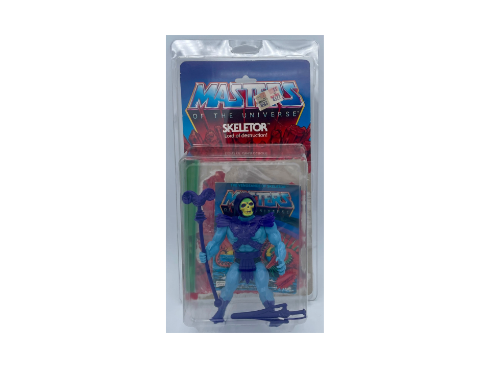La première figurine Skeletor de la première ligne He Man reste l’un des méchants les plus emblématiques de l’histoire du jouet des années 80 lorsqu’elle est toujours scellée sur sa carte originale à huit dos. Cette première version ne montre que le premier ensemble de personnages au dos, et ce détail compte beaucoup pour les collectionneurs qui recherchent les premières versions de jouets classiques. Ces dernières années, un Skeletor de 1982 non perforé, scellé et cardé sur une première carte aurait été vendu aux enchères pour environ 5 250 $, ce qui donne une idée claire de ce que peuvent atteindre les meilleurs exemplaires.