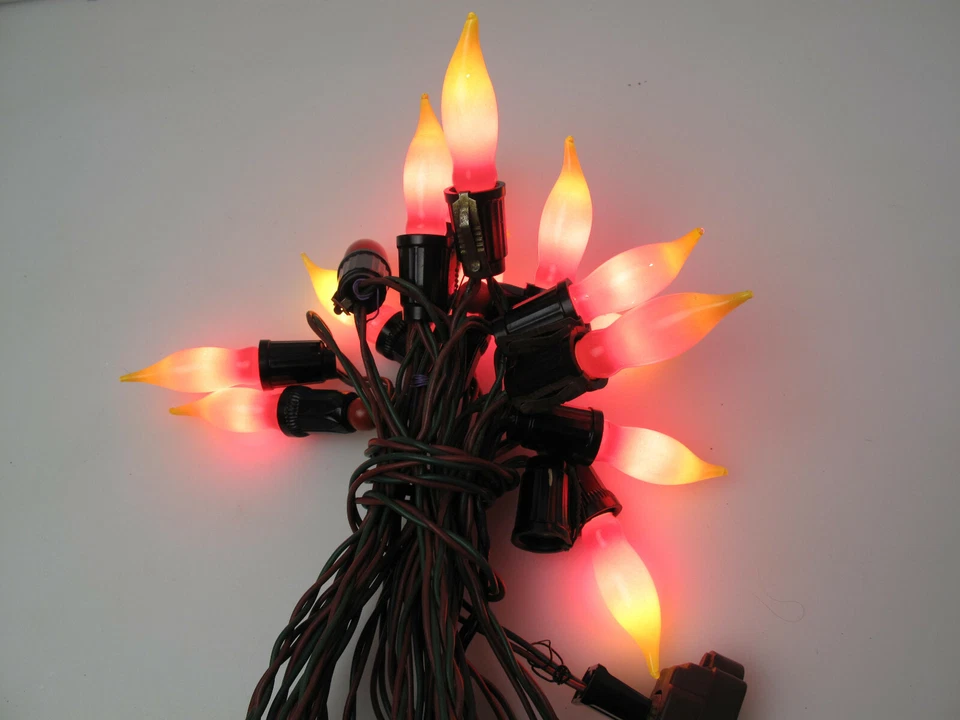 Dans de nombreuses maisons au cours des années 1950, NOMA vendait des chaînes C7 avec des ampoules en forme de flamme pour la décoration intérieure ou extérieure. L’aspect chaleureux vient de la silhouette de la flamme et du verre légèrement teinté à l’ancienne. Une estimation courante du marché pour un coffret qui fonctionne est d’environ 40 à 70 dollars. Vous les verrez répertoriées comme ampoules Mazda dans certains emballages vintage. Ils semblent toujours charmants parce qu’ils ressemblent aux lumières dont les gens se souviennent sur les porches et les bords des toits.