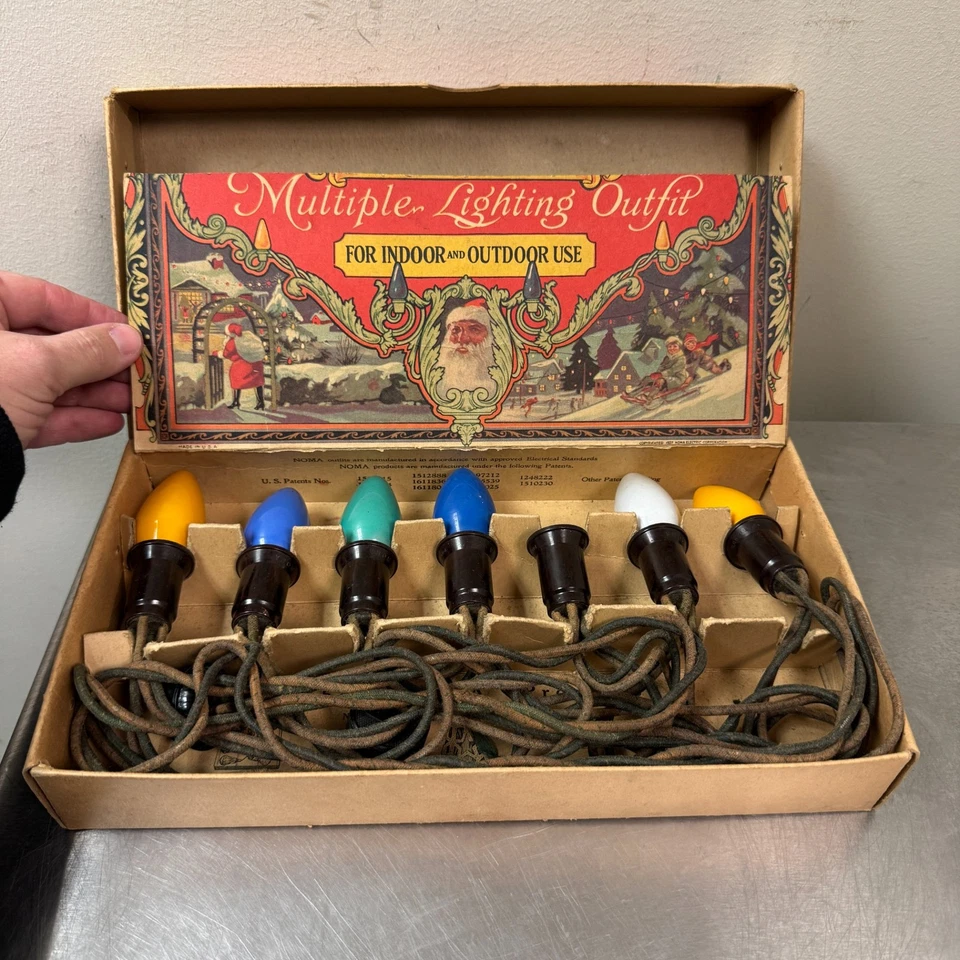 Les décors extérieurs C9 sont devenus plus courants dans les années 1950, alors que les lumières de Noël se propageaient au-delà de l’arbre et dans les cours et les toits. NOMA vendait des ensembles d’apparence robuste, et beaucoup incluaient des composants classiques comme des clignotants. Le charme vient de l’aspect de l’ampoule plus grande et des douilles robustes de style ancien. Une estimation réaliste du marché pour un ensemble de travail complet se situe entre 30 et 75 dollars, avec des prix plus élevés pour les boîtes de nettoyage. De nombreux collectionneurs les conservent comme pièces d’exposition, car les cordons plus anciens peuvent présenter des risques lorsqu’ils sont branchés.