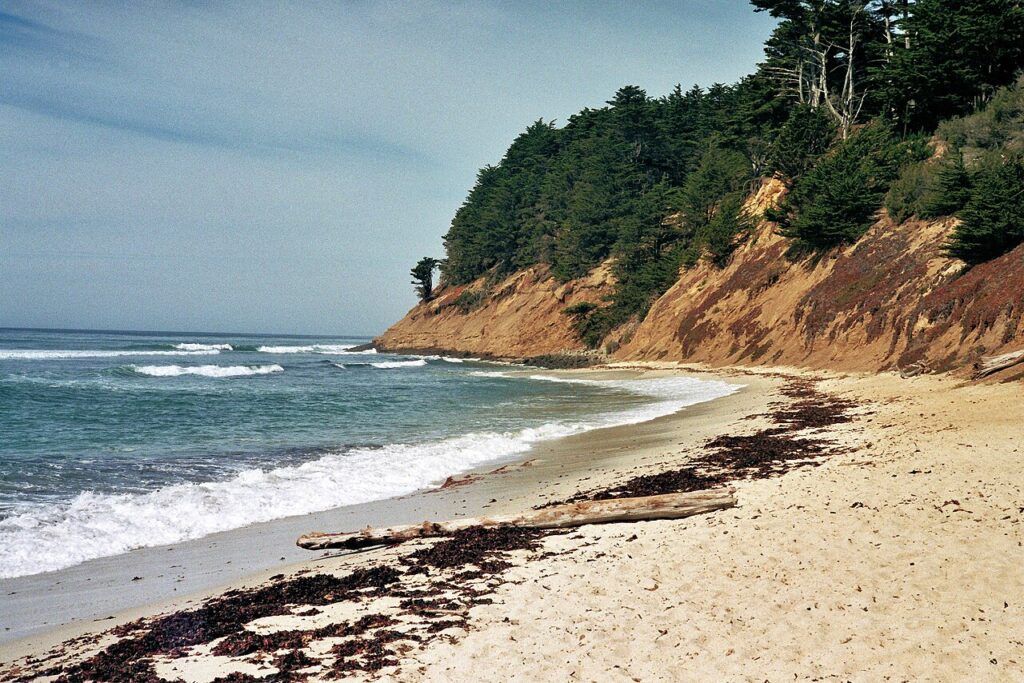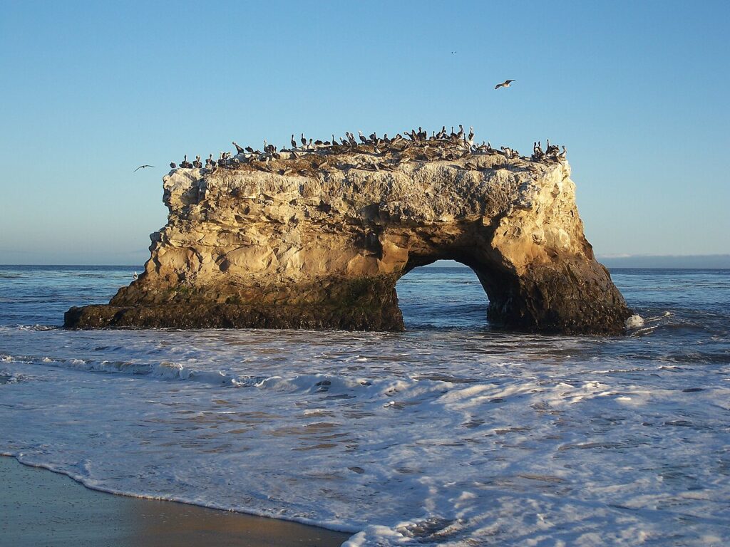 Natural Bridges est facile à aimer car vous pouvez vous garer, marcher sur une courte distance et avoir l’impression d’être au cœur de l’action. Les vagues de fin d’hiver et les nuages peuvent donner à la plage un aspect encore plus spectaculaire. Les bassins de marée se trouvent à proximité des zones les plus rocheuses et vous pouvez garder la promenade simple sur le sable si vous préférez. La célèbre vue sur l’arche rocheuse ajoute un moment « wow » avant même de commencer à regarder dans les piscines.