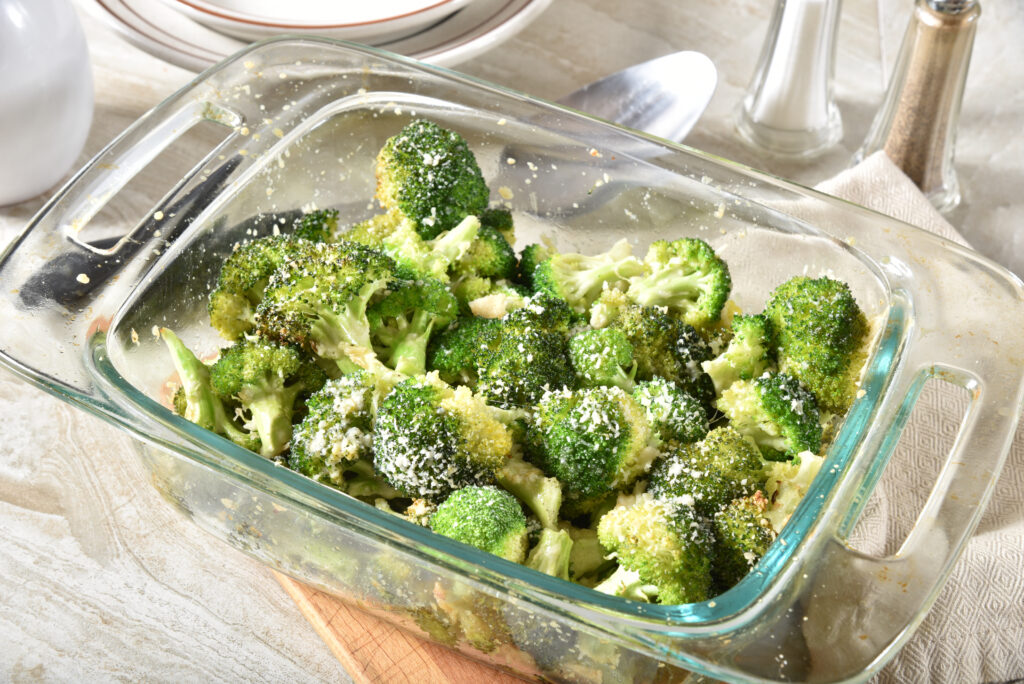 Vous aurez besoin de 4 tasses de fleurons de brocoli, 2 cuillères à soupe d’huile d’olive, 1,4 cuillère à café de sel, 1,4 cuillère à café de poudre d’ail et 1,3 tasse de parmesan râpé. Le temps de préparation est d’environ 8 minutes.