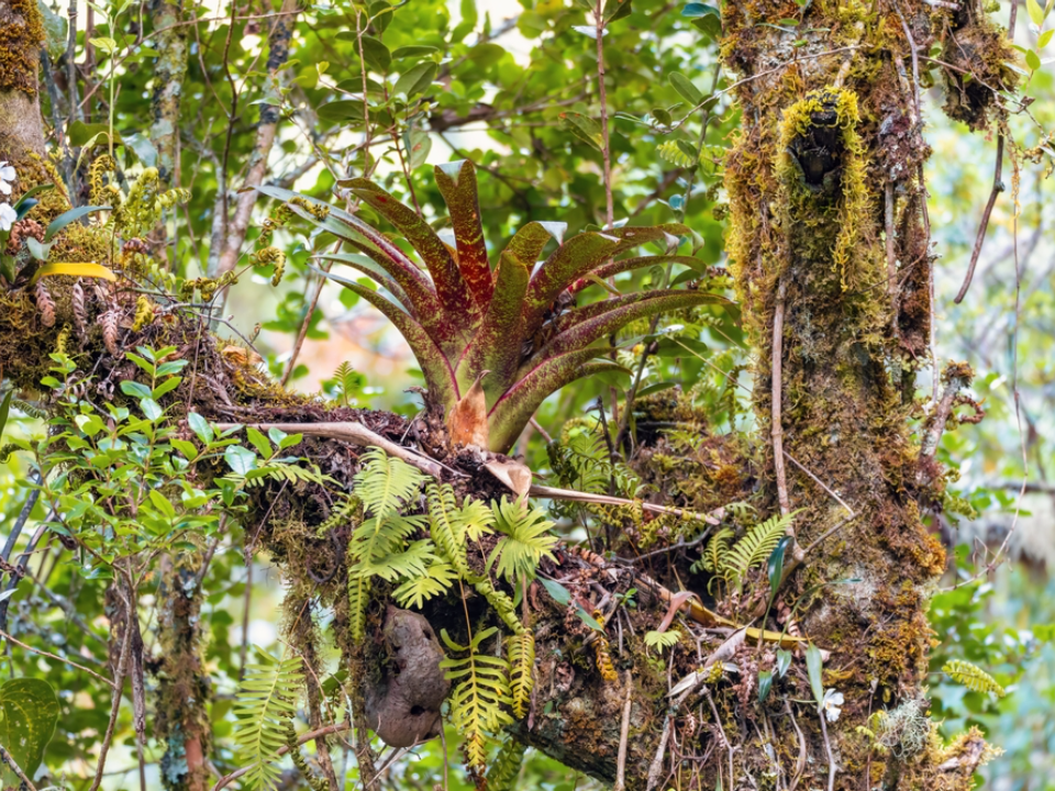 Les broméliacées sont un autre groupe de plantes qui peuvent pousser sur les arbres sans nuire à leur hôte. Ces plantes se trouvent couramment dans les zones tropicales, où elles peuvent s’attacher aux branches des arbres et aux rochers. Les broméliacées ont des feuilles spécialisées qui forment une rosette, créant une structure en forme de coupe qui recueille l’eau de pluie et les nutriments provenant de la matière organique en décomposition. Cela leur permet de prospérer sans puiser de ressources directement dans l’arbre.