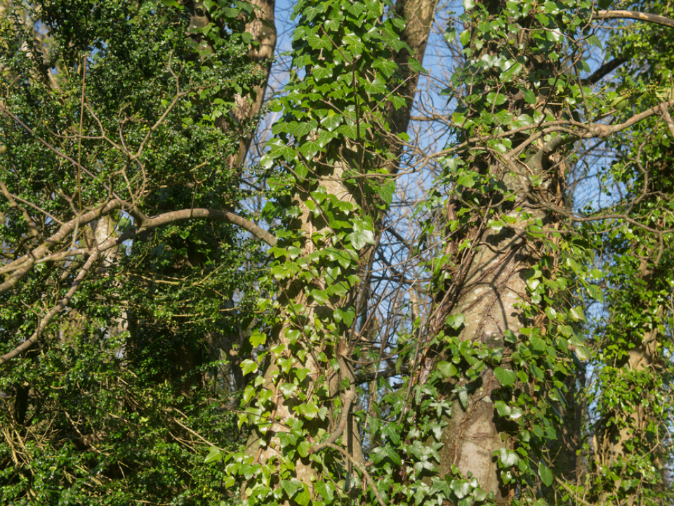 Le lierre peut pousser en zones denses, recouvrant les troncs et les branches des arbres, mais il ne nuit pas à l’arbre à moins qu’il ne devienne excessivement lourd. L’arbre fournit un support au lierre, lui permettant d’accéder à la lumière du soleil plus haut dans la canopée. En retour, le lierre offre un abri aux petits animaux, notamment aux oiseaux et aux insectes. Cette relation entre le lierre et ses arbres hôtes est une relation de coexistence plutôt que de parasitisme.