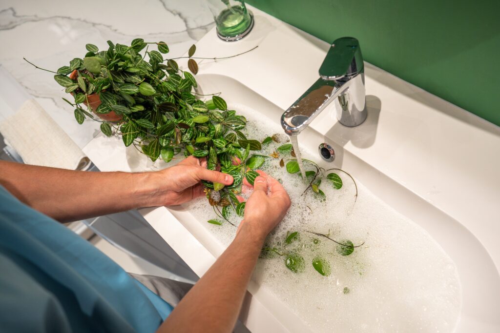 Rincez les feuilles dans l’évier ou la douche pour éliminer les résidus. Essuyez le dessus et le dessous des feuilles, car les insectes se cachent dans les endroits exigus. Gardez la plante éloignée des autres jusqu’à ce que vous sachiez que les parasites ont disparu. Un nettoyage répété peut être nécessaire si les insectes reviennent.