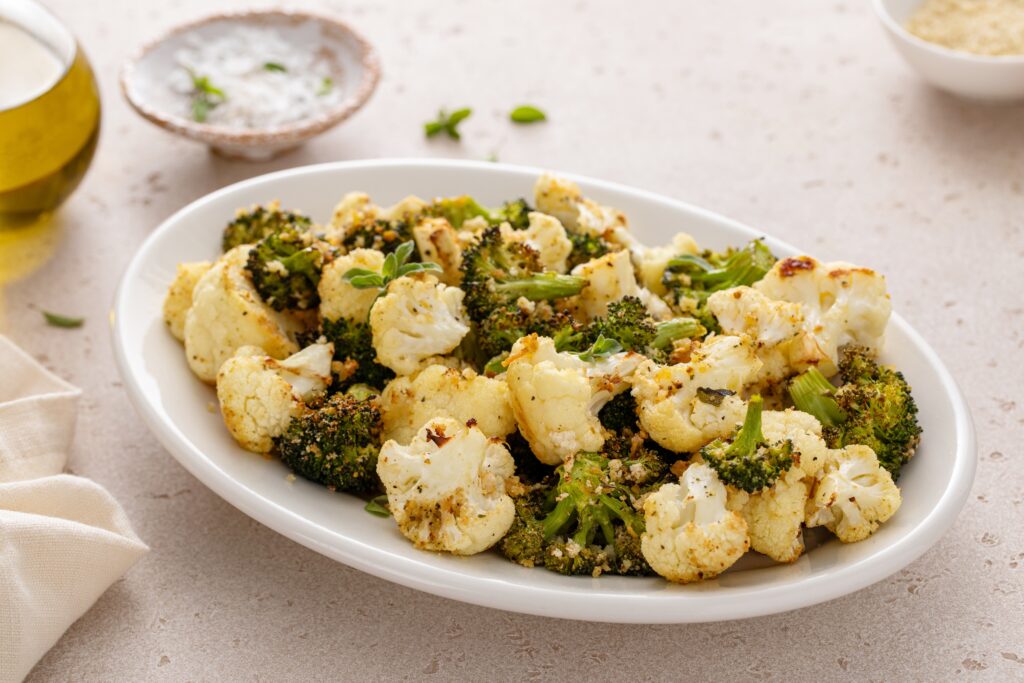 Brocoli et chou-fleur rôtis avec trempette au cheddar