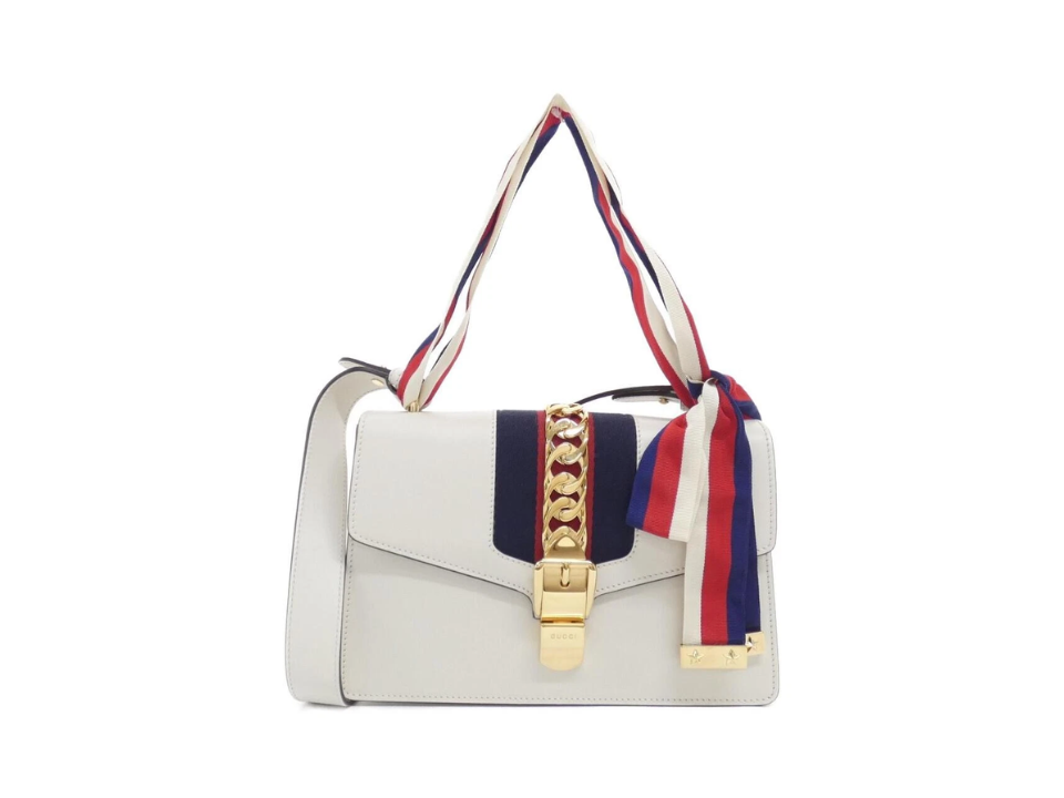 Le sac Sylvie a été lancé en 2016 et est connu pour son détail de la chaîne en or avec une fermeture de boucle. Son design structuré lui donne une apparence polie. De nombreuses versions incluent la bande Web signature de Gucci sous la chaîne. Le sac reflète des éléments Gucci classiques et modernes.