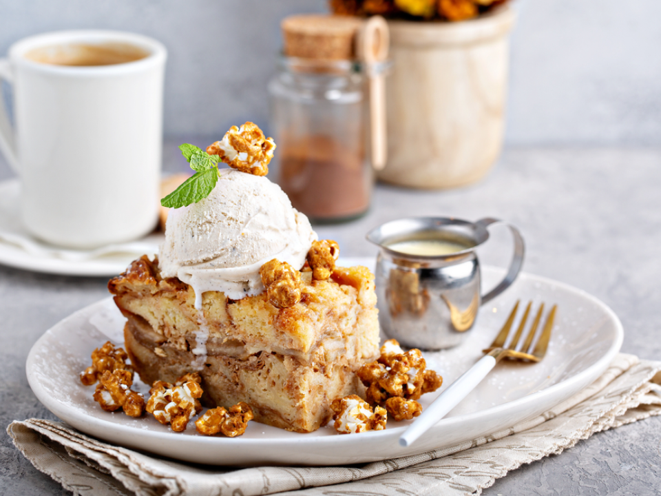 Pour le pudding, mélangez 3 tasses de pain en cubes, 2 tasses de lait, 2 œufs, un quart de tasse de sucre et 1 cuillère à café de vanille. Cuire au four à 350°F pendant 30 minutes jusqu’à ce que le tout soit pris. Pour le latte, mélangez une demi-tasse de café fort, 1 tasse de lait cuit à la vapeur et 2 cuillères à soupe de sauce caramel. Bien mélanger et servir chaud.