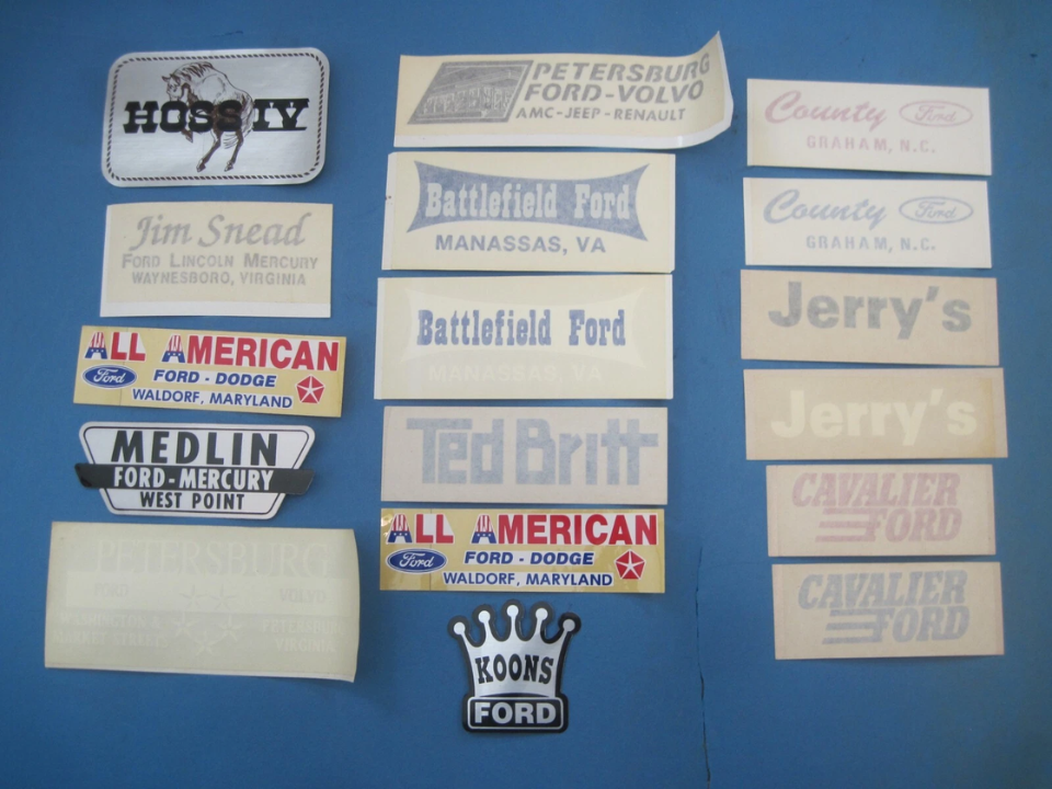 Les autocollants de fenêtre vintage des concessionnaires automobiles, une fois appliqués sur les véhicules pour faire la publicité du concessionnaire ou de modèles spécifiques, sont devenus des objets rares et précieux. Ces autocollants, souvent conçus avec des polices audacieuses et des couleurs vives, ont un attrait rétro distinct, en particulier ceux des années 1960 et 1970. Même si bon nombre de ces autocollants ont été utilisés sur des voitures et ont fini par être usés, certains exemplaires intacts ont survécu et sont désormais considérés comme des objets de collection.