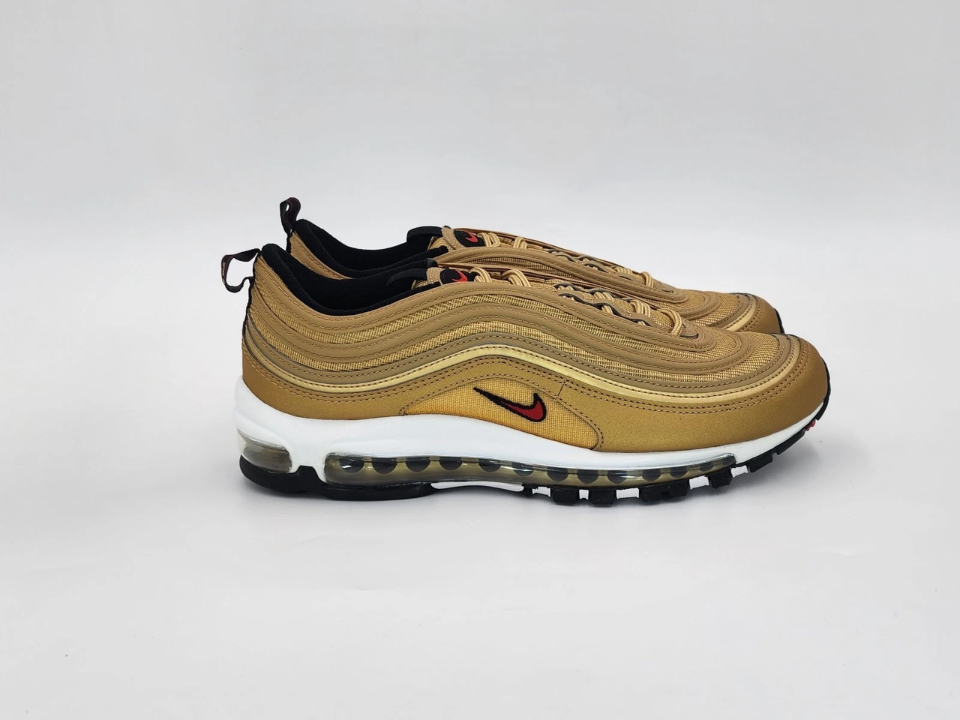 La Nike Air Max 97 « Gold Bullet » est devenue un symbole de la culture sneaker depuis sa sortie en 1997. Le design élégant de la sneaker avec des détails réfléchissants argentés et dorés en a fait une pièce remarquable de la ligne Air Max de Nike. Le « Gold Bullet » était particulièrement important car il faisait partie des débuts de la Air Max 97, qui introduisait un amorti Air visible sur toute la longueur.