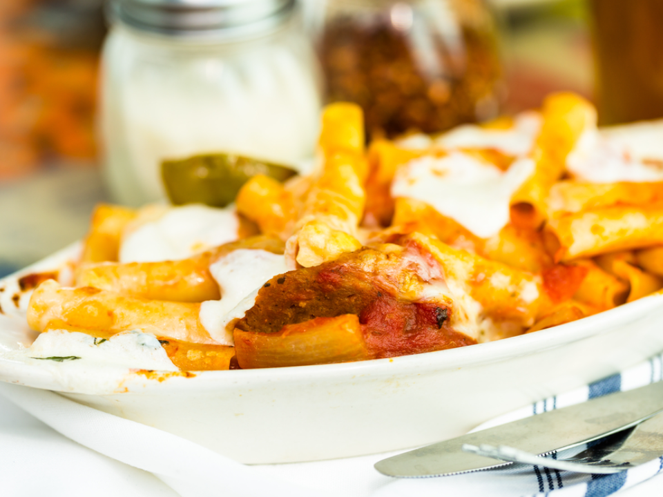 Cuire 1 livre de ziti et égoutter. Faire revenir 1 livre de saucisse italienne et retirer l’excès de gras. Mélangez les pâtes avec 3 tasses de sauce marinara, 2 tasses de ricotta et 1 tasse de mozzarella râpée. Transférer dans un plat allant au four graissé et garnir de 1 tasse supplémentaire de mozzarella. Couvrir et réfrigérer jusqu’à 24 heures. Cuire au four à 375 degrés Fahrenheit pendant 35 minutes à couvert, puis découvrir et cuire au four 10 minutes.