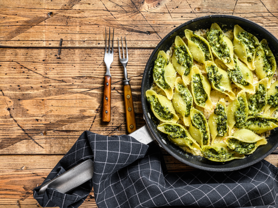 Faites cuire 20 coquilles géantes et égouttez-les. Mélangez 2 tasses de ricotta, 1 tasse de mozzarella, 1 tasse d’épinards hachés cuits et 1 œuf. Remplissez les coquilles et placez-les dans un plat allant au four avec 2 tasses de marinara. Garnir de 1 tasse de mozzarella. Couvrir et réfrigérer toute la nuit. Cuire au four à 375 degrés Fahrenheit pendant 35 minutes.