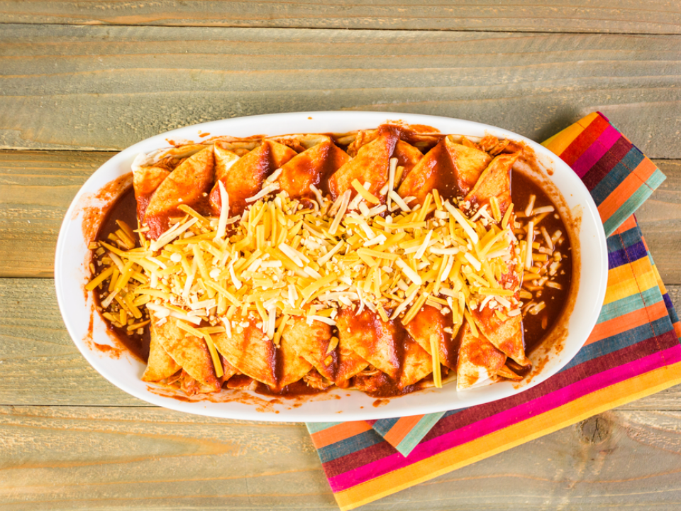 Mélangez 2 tasses de poulet râpé cuit avec 2 tasses de sauce enchilada. Disposez les tortillas, le poulet et 2 tasses de fromage râpé dans un plat allant au four. Répétez une fois. Couvrir et réfrigérer toute la nuit. Cuire au four à 375 degrés Fahrenheit pendant 35 minutes.