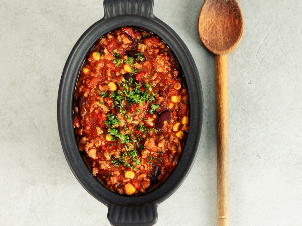 Faire revenir 2 livres de bœuf haché et égoutter l’excès de graisse. Ajoutez 1 oignon haché, 2 boîtes de tomates en dés, 2 boîtes de haricots rouges et 2 cuillères à soupe de poudre de chili. Laisser mijoter 45 minutes. Laisser refroidir et réfrigérer toute la nuit. Réchauffer doucement sur le feu avant de servir.