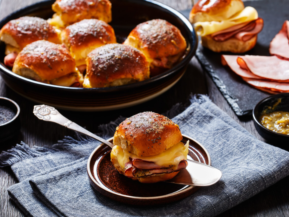 Coupez 12 petits pains en deux et superposez le jambon et le fromage à l’intérieur. Placer dans un plat allant au four. Badigeonner le dessus de 4 cuillères à soupe de beurre fondu mélangé à 1 cuillère à café de moutarde. Couvrir et réfrigérer toute la nuit. Cuire au four à 350 degrés Fahrenheit pendant 25 minutes jusqu’à ce qu’il soit bien chaud.