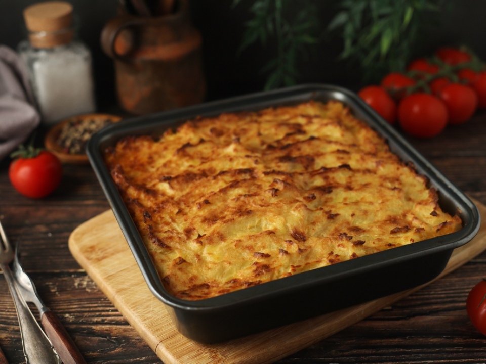 Faire revenir 1 livre et demi de bœuf haché avec 1 oignon haché. Incorporer 1 tasse de bouillon de bœuf et 1 tasse de légumes surgelés. Répartir dans un plat allant au four. Garnir de purée de pommes de terre. Couvrir et réfrigérer toute la nuit. Cuire au four à 375 degrés Fahrenheit pendant 40 minutes.