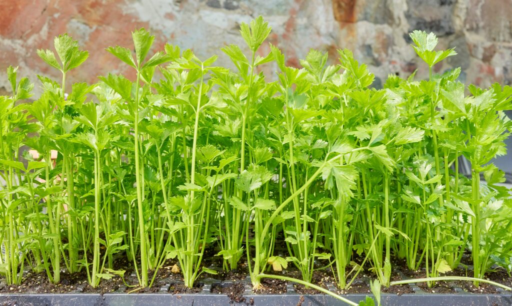 Les graines de céleri sont minuscules et ont besoin de lumière pour germer, alors pressez-les sur la surface au lieu de les enterrer. Ils peuvent mettre un certain temps à germer et ils aiment une humidité constante tout le temps. La chaleur aide au début, mais une fois qu’elle apparaît, une lumière forte est la priorité. Commencez à nourrir légèrement une fois que les vraies feuilles se forment, car le céleri est un aliment plus lourd que de nombreux semis.