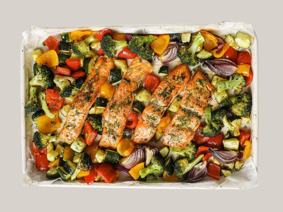 Vous aurez besoin de 2 filets de saumon, 1 courgette coupée en rondelles, 1 poivron tranché, 1 cuillère à soupe d’huile d’olive, 1 cuillère à café de zeste de citron, du sel et du poivre au goût. Préchauffer le four à 400 degrés Fahrenheit (200 degrés Celsius). Placer les filets de saumon sur une plaque à pâtisserie et disposer autour d’eux les tranches de courgette et de poivron. Versez un filet d’huile d’olive sur le saumon et les légumes et saupoudrez de zeste de citron, de sel et de poivre. Cuire au four pendant 15 à 20 minutes jusqu’à ce que le saumon soit complètement cuit et que les légumes soient tendres. Garnir de tranches de citron et servir immédiatement.