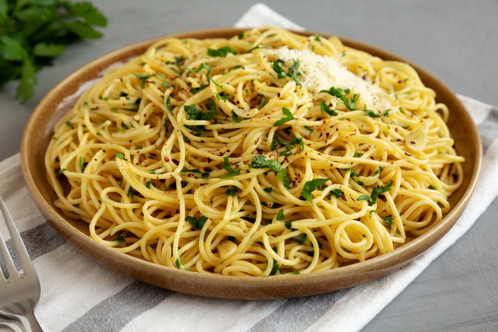 Pour ce plat, rassemblez 8 oz de spaghettis, 3 gousses d’ail émincées, un quart de cuillère à café de flocons de piment, 2 cuillères à soupe d’huile d’olive et du sel et du poivre au goût. Cuire les spaghettis dans une grande poêle selon les instructions sur l’emballage. Dans la même poêle, faites chauffer l’huile d’olive à feu moyen et faites revenir l’ail pendant 1 à 2 minutes jusqu’à ce qu’il soit parfumé. Ajoutez les flocons de piment, le sel et le poivre, puis mélangez les pâtes cuites dans le mélange d’huile et servez immédiatement.