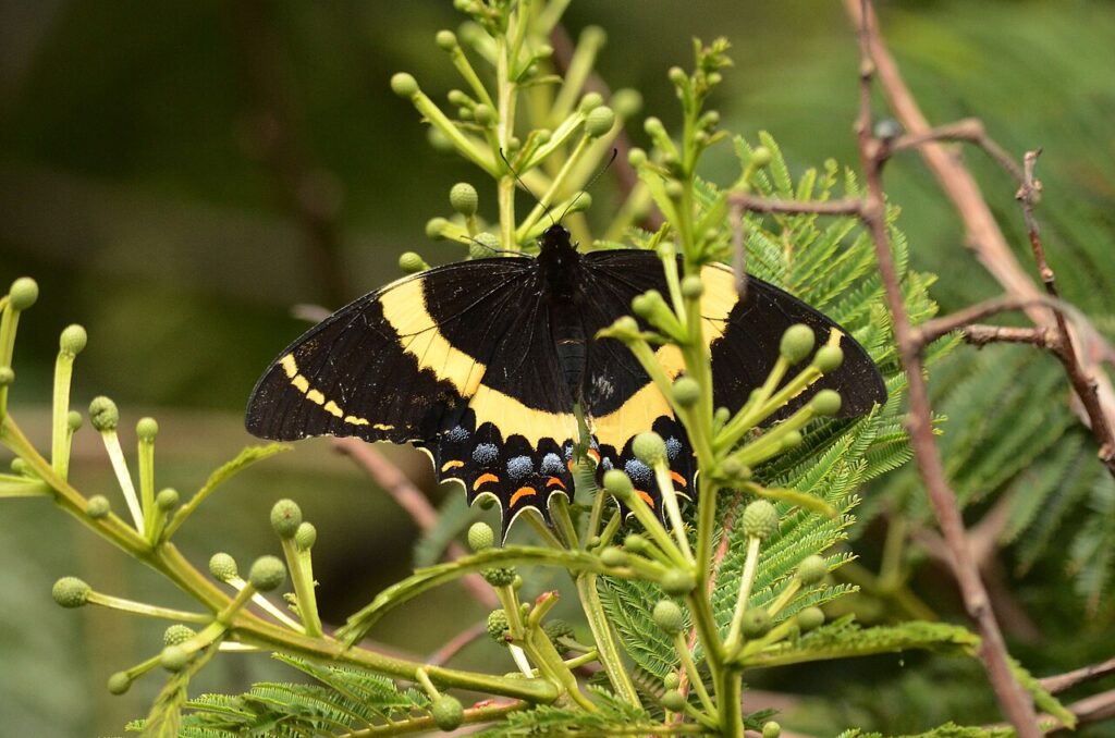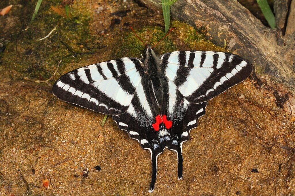 Trouvé dans certaines parties du sud-est des États-Unis, le papillon zèbre est rare en raison de son habitat en déclin. Ses ailes sont rayées de noir et de blanc, ressemblant aux motifs d’un zèbre, ce qui le rend facile à identifier. Bien qu’il ne soit pas éteint, le machaon zèbre est menacé par la perte de son habitat et les changements environnementaux. On l’observe le plus souvent dans les zones où pousse sa plante hôte, le papayer.