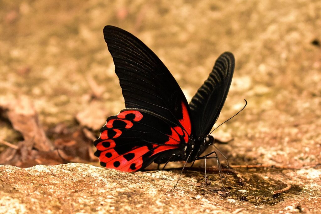 Le papillon machaon écarlate se trouve dans certaines régions d’Asie tropicale, où il est rare en raison de ses ailes rouges et noires brillantes. Les rayures rouges vifs sur ses ailes sont sa caractéristique la plus frappante et le distinguent. Ce papillon n’est pas éteint mais est rare en raison de la perte de son habitat. Sa superbe coloration en fait un papillon prisé des collectionneurs.
