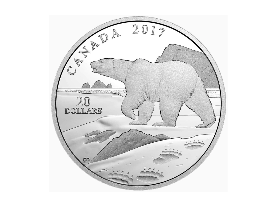La pièce de 20 $ canadienne de la série Faune 2017 présente un motif saisissant représentant un ours polaire, l’un des animaux les plus emblématiques des régions arctiques du pays. La pièce est en argent pur et pèse 1 once. Le revers présente l’ours dans son habitat naturel, avec la toundra gelée en toile de fond.