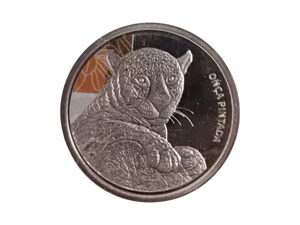 La pièce de 50 reais du Brésil de 2016 représente le jaguar, l’un des prédateurs les plus puissants de la forêt amazonienne. Le jaguar est capturé à pleine foulée, avec sa silhouette musclée et son pelage tacheté distinctif. Connu pour sa furtivité et sa force, le jaguar est un élément essentiel de la faune brésilienne, notamment dans le bassin amazonien. Cette pièce, frappée en argent pur .999, a été émise pour souligner l’importance de la conservation de la faune au Brésil.