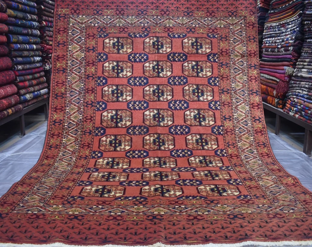 Un tapis Boukhara est connu pour ses motifs ovales répétés qui s’alignent en rangées soignées, ce qui lui donne un aspect calme et ordonné. Beaucoup sont dans des rouges profonds et des tons chauds, mais vous pouvez également trouver des versions plus douces et plus atténuées. Le motif répétitif lui confère une sensation de stabilité, ce qui lui permet de fonctionner bien dans les longs couloirs et les pièces étroites. C’est un style classique qui ne se bat pas avec les autres décors.
