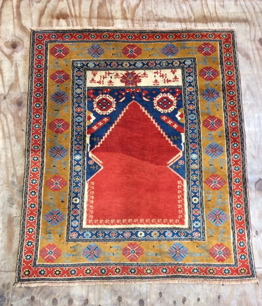 Un tapis de prière anatolien a généralement une forme de niche à une extrémité qui ressemble à un arc, ce qui le rend immédiatement reconnaissable. Les motifs peuvent être géométriques ou floraux, et les couleurs sont souvent chaudes et terreuses, avec des tons rouges, bleus et dorés. Même s’ils ont été fabriqués dans un but précis, ils fonctionnent à merveille comme pièces décoratives dans une maison. Un petit tapis de prière peut ajouter du caractère à un endroit qui semble vide.