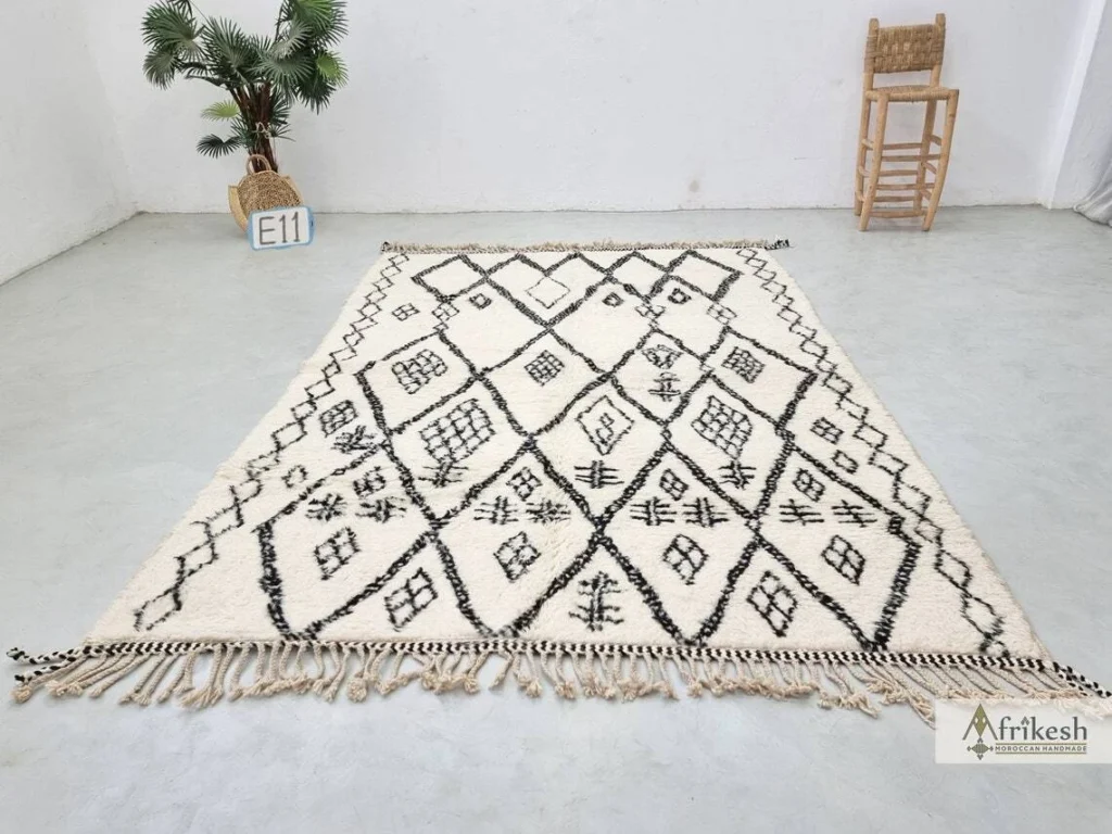 Un tapis marocain Beni Ourain est généralement blanc crème avec de simples lignes sombres, souvent en forme de losange. Le look est épuré et doux, mais il a toujours une texture et une chaleur qui rendent immédiatement une pièce confortable. Le poil peut être épais et moelleux, c’est pourquoi les gens l’adorent dans les chambres et les salons. C’est un style qui s’adapte aux maisons modernes tout en restant ancien et ancré.