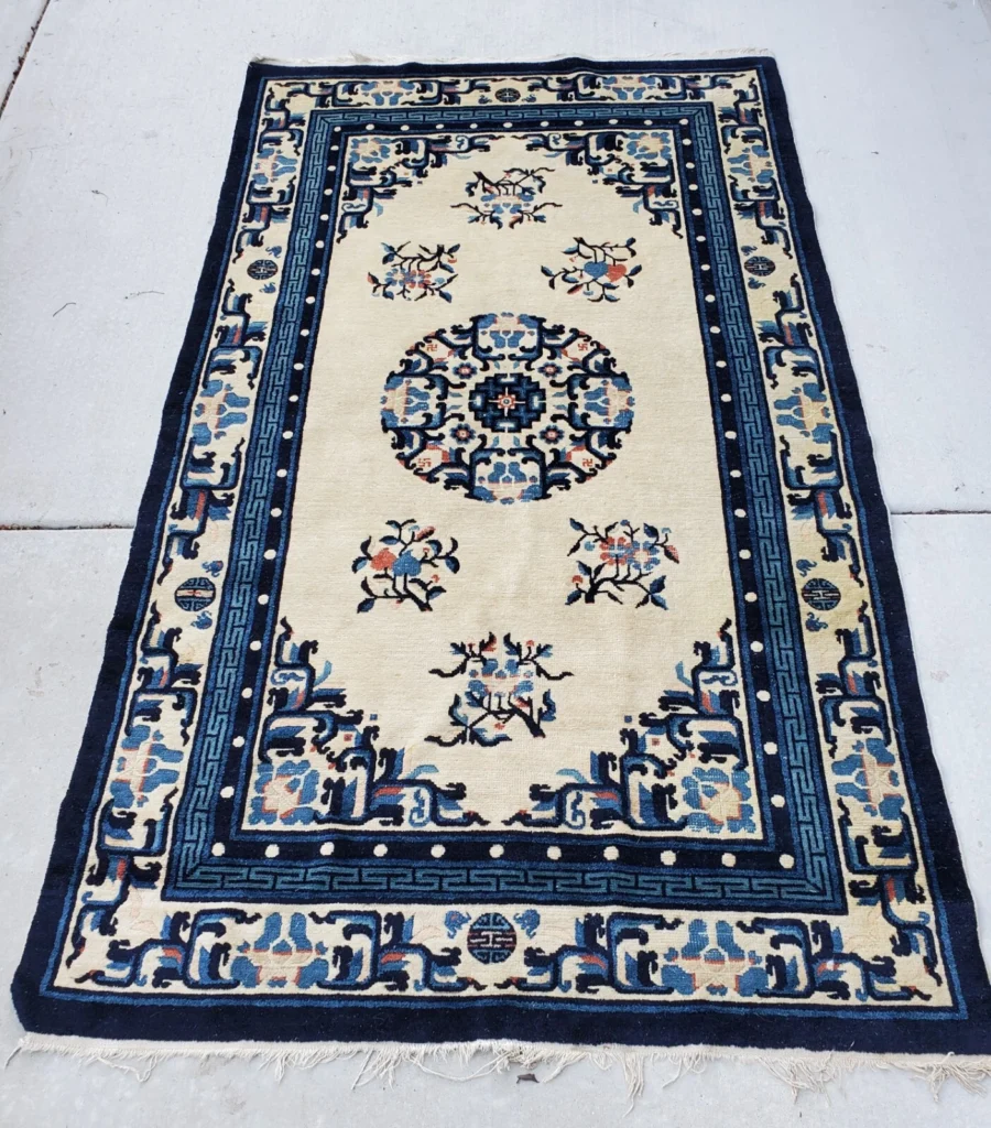 Un tapis chinois de Pékin dégage souvent une sensation calme et ouverte avec des dispositions plus simples et une sensation d’espace plus douce. Vous pourriez voir un motif central, une large bordure et beaucoup d’espace négatif, ce qui peut rendre une pièce plus aérée. De nombreux exemples plus anciens utilisent des bleus, des ors et des tons neutres doux qui s’agencent parfaitement avec les antiquités et les pièces du milieu du siècle. C’est un bon choix lorsque vous souhaitez un motif, mais que vous ne voulez pas que la pièce soit occupée.