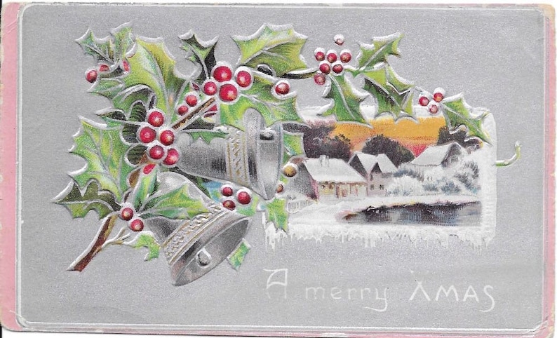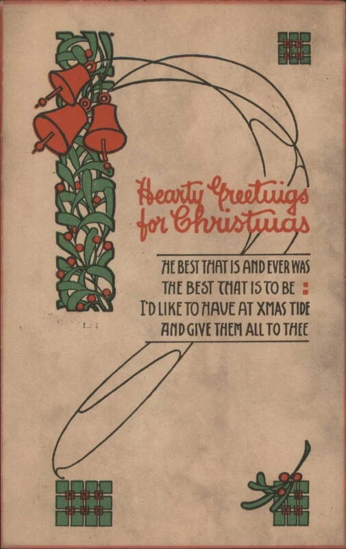 Cette carte présente de délicates feuilles de houx de style Art Nouveau avec des cloches dorées. Baumgarten était l’une des premières sociétés américaines de cartes de vœux, connue pour ses imprimés décoratifs avant la Première Guerre mondiale. Les collectionneurs aiment cette carte pour son style artistique qui montre un moment où la conception des cartes a été influencée par les mouvements artistiques de l’époque. En bon état, ces cartes peuvent être évaluées entre 40 et 110 dollars environ, selon l’intérêt du collectionneur. Le travail des lignes fines et les tons doux en font une carte paisible à visualiser.