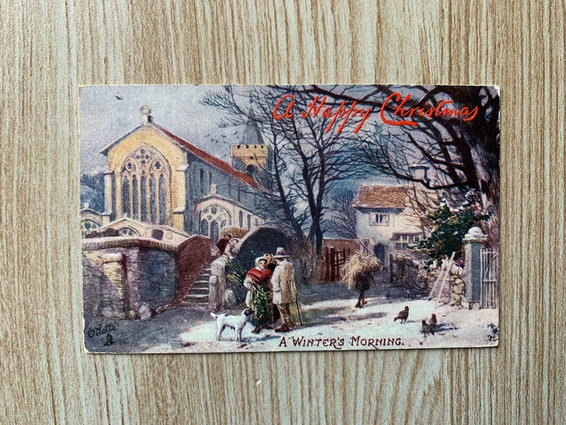 L’enveloppe originale porte souvent une marque postale nette qui permet de dater la carte. La luminosité de la scène et le manque d’usure dans les coins ajoutent à ce que quelqu’un pourrait payer. Beaucoup de ces cartes présentent de légères fissures superficielles que certains collectionneurs considèrent comme faisant partie de leur âge. Ces vues hivernales rappellent aux gens les traditions de vacances d’avant les imprimés modernes. C’est un rare aperçu de l’apparence des vœux saisonniers dans les vieilles villes.