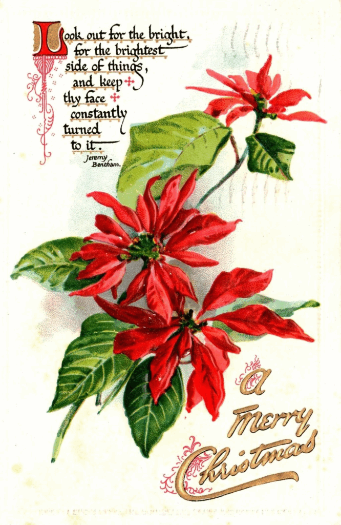 Cette carte présente des poinsettias lumineux sur un fond aux couleurs douces. Le nom de Raphael Tuck donne du poids aux collectionneurs qui se concentrent sur la production de cette entreprise. Les poinsettias étaient des fleurs de vacances populaires et cette carte les montre en pleine floraison. Des exemplaires en excellent état peuvent se vendre entre 50 et 120 dollars. Le thème des fleurs et des rubans semble classique pour ceux qui aiment l’art des fêtes à l’ancienne.