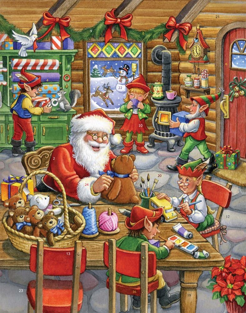 Sorti au début des années 1960, ce calendrier montre des lutins travaillant dans l’atelier du Père Noël. Il reflète les thèmes de vacances ludiques de l’époque. Les prix du marché varient généralement entre 250 et 600 dollars. Les collectionneurs apprécient les scènes illustrées chargées. Le style s’adapte bien au décor du milieu du siècle.