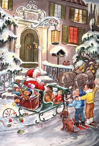 Ce dessin est apparu dans les années 1930 et met en valeur une ville bavaroise enneigée. Il a été produit par la célèbre société Sellmer Verlag. Aujourd’hui, la valeur marchande se situe généralement entre 800 $ et 2 000 $. Les collectionneurs privilégient souvent les scènes chaleureuses du village et la finesse des détails. Le calendrier reflète les styles artistiques des fêtes d’avant-guerre.