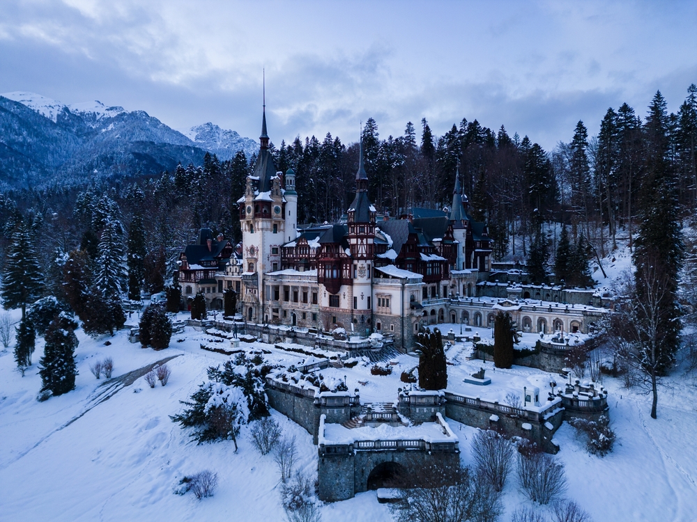 Le château de Peleș, niché dans les montagnes des Carpates de Roumanie, est un superbe exemple d’architecture néo-Renaissance. En hiver, le château et ses environs sont recouverts de neige, créant une atmosphère majestueuse et sereine. Le château a été construit entre 1873 et 1914 et servait de résidence royale à la famille royale roumaine. La grandeur du château, combinée à son environnement boisé, en fait l’une des destinations hivernales les plus pittoresques d’Europe.