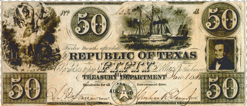 Émis par la République du Texas au cours de sa brève existence en tant que nation indépendante entre 1836 et 1845, ce billet de 50 $ faisait partie d’une tentative de créer une économie fonctionnelle. Après que le Texas soit devenu un État des États-Unis, la monnaie a rapidement perdu de sa valeur et a été largement remplacée par le dollar américain. En raison de la courte durée de vie de la République, très peu de ces billets restent aujourd’hui en circulation. La valeur d’un billet de 50 $ de haute qualité en provenance de la République du Texas varie de 3 000 $ à 10 000 $.